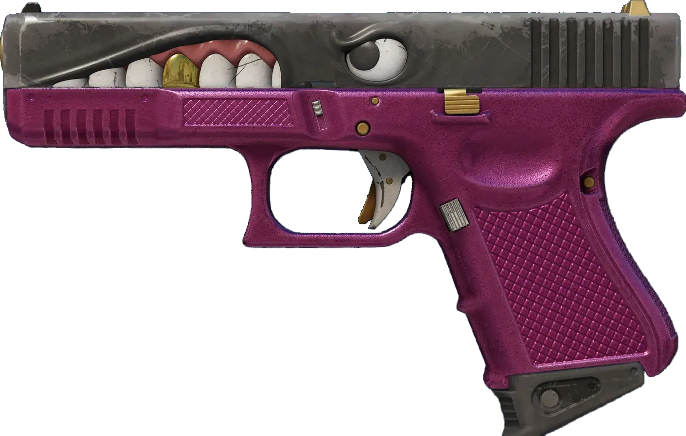The Glock 18 is a serviceable first-round pistol that works best against unarmored opponents and is capable of firing three-round bursts. It has been custom painted with a pink grip and an aggressive forward-facing gaze. _"This one's for you!"_