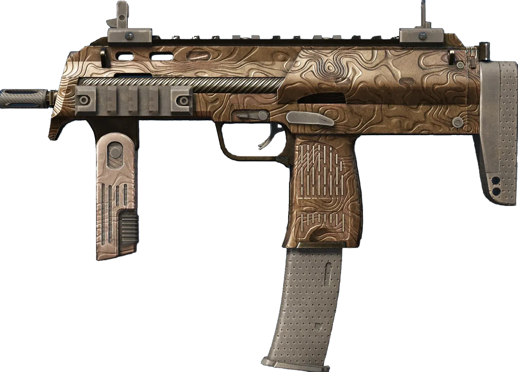 Versatile but expensive, the German-made MP7 SMG is the perfect choice for high-impact close-range combat. The lines of this custom paint job resemble grooves on a topographical map. _Bleed between the lines_