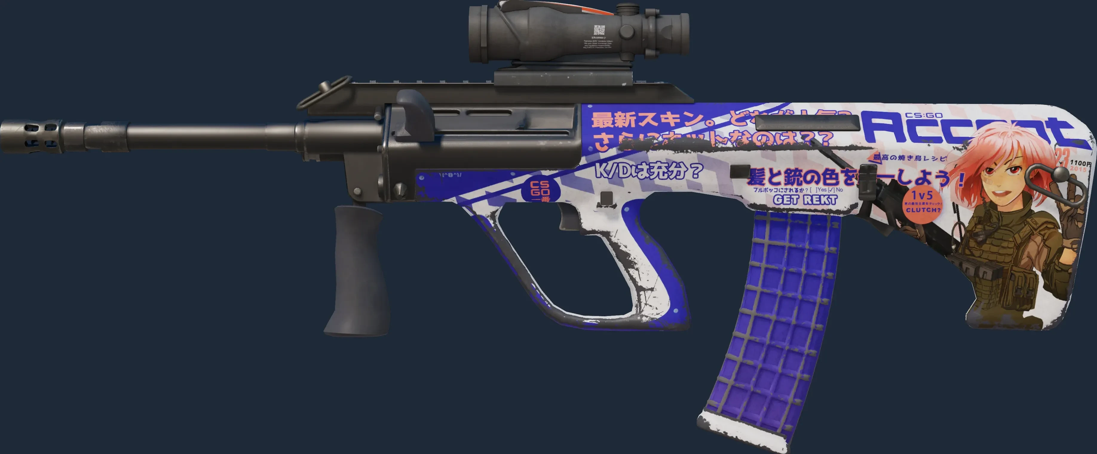 The AUG | Akihabara Accept is a Covert grade skin for the AUG in Counter-Strike 2. It features a Custom Paint Job finish and was designed by Valve.