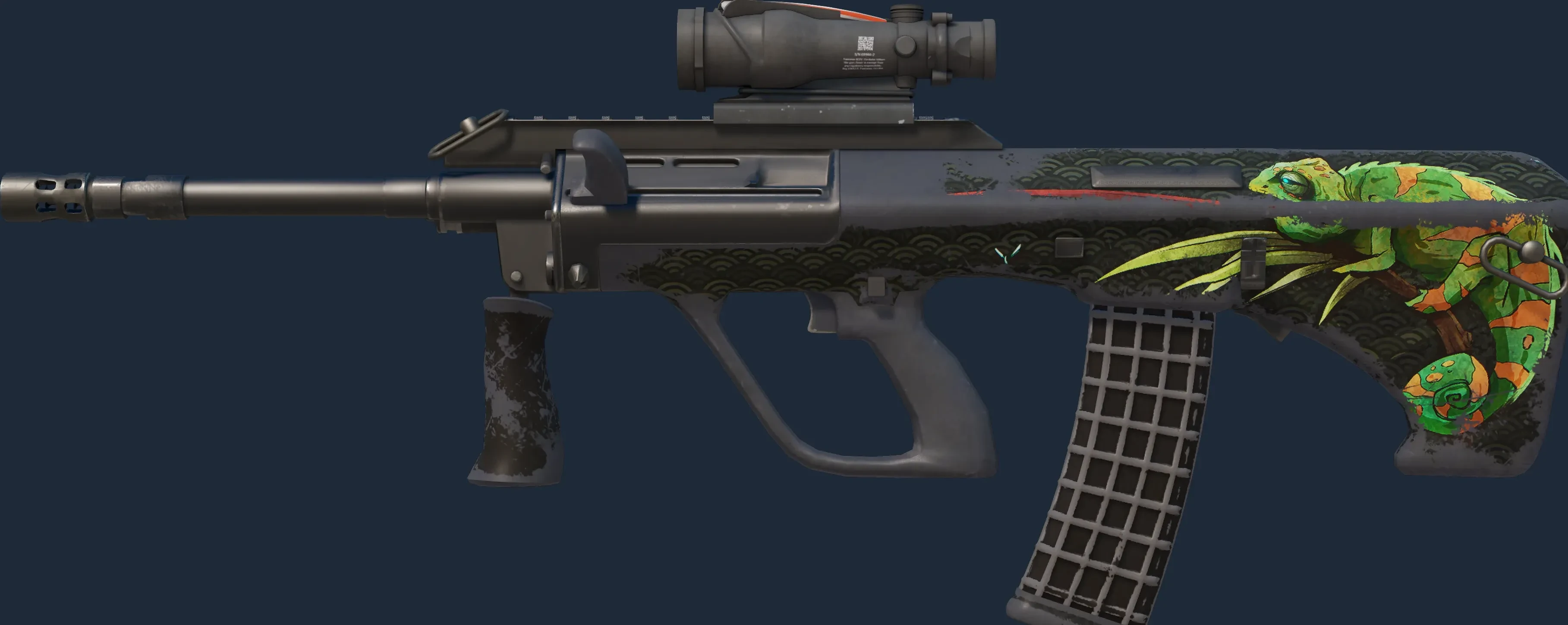 The AUG | Chameleon is a Covert grade skin for the AUG in Counter-Strike 2. It features a Custom Paint Job finish and was designed by Zaphk.