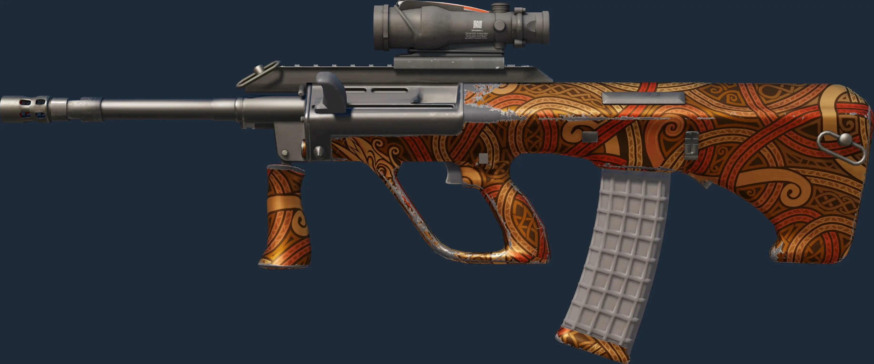 The AUG | Flame Jormungandr is a Covert grade skin for the AUG in Counter-Strike 2. It features a Custom Paint Job finish and was designed by Valve.