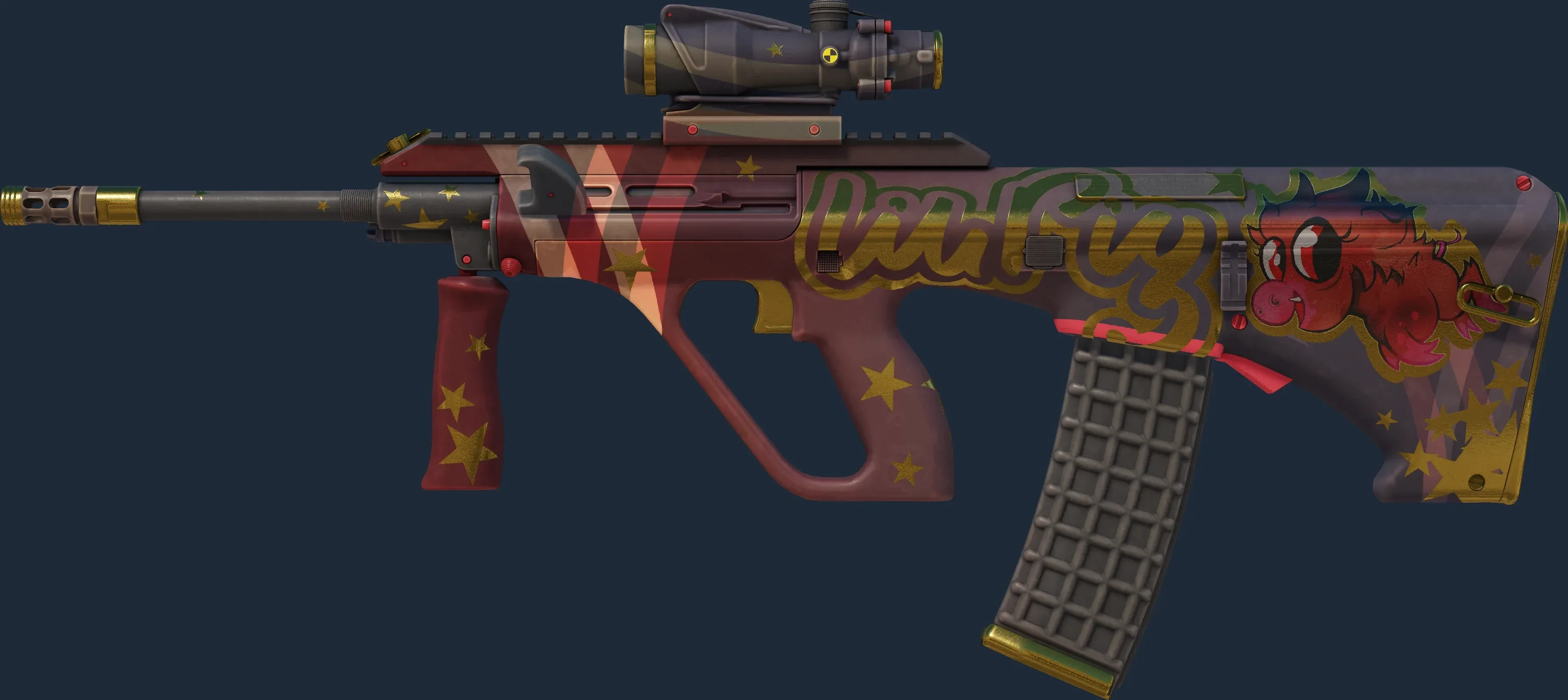 The AUG | Lil Pig is a Covert grade skin for the AUG in Counter-Strike 2. It features a Custom Paint Job finish and was designed by Valve.
