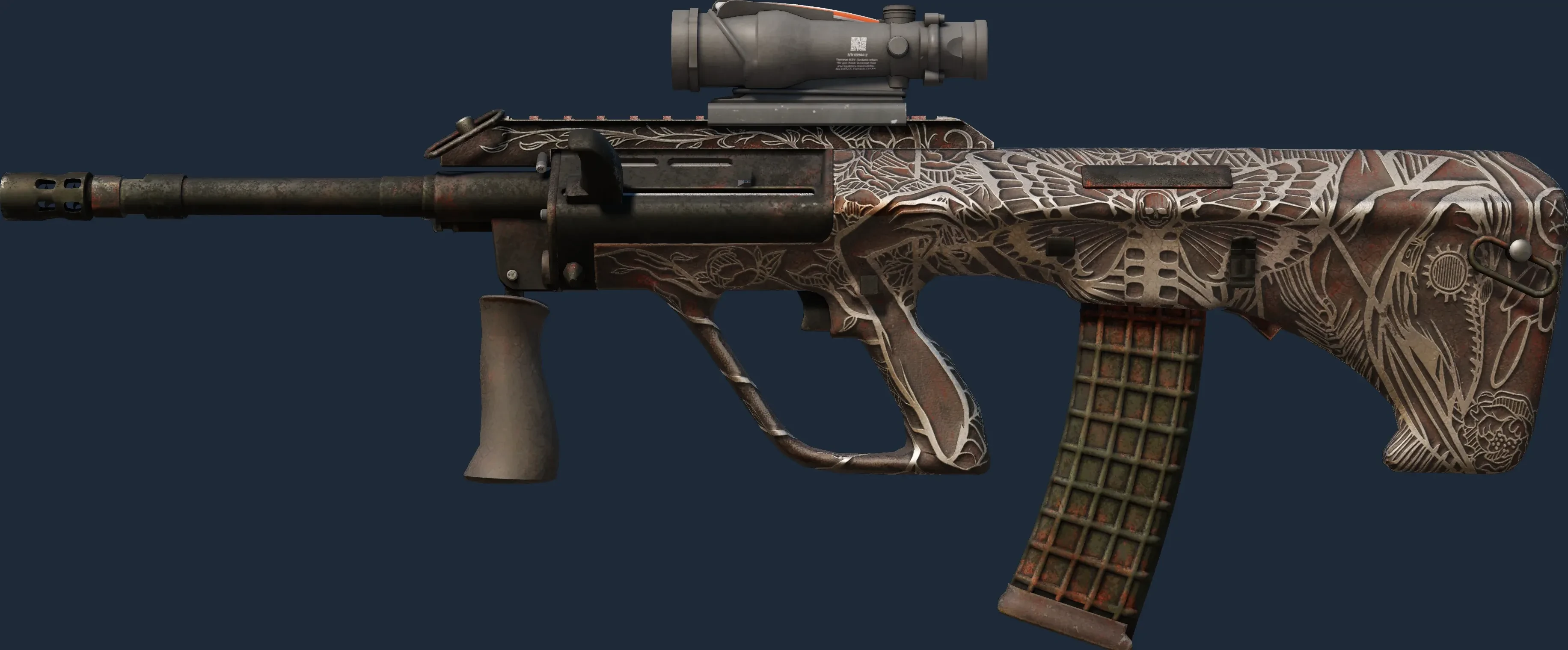 The AUG | Plague is a Covert grade skin for the AUG in Counter-Strike 2. It features a Custom Paint Job finish and was designed by hexeth.