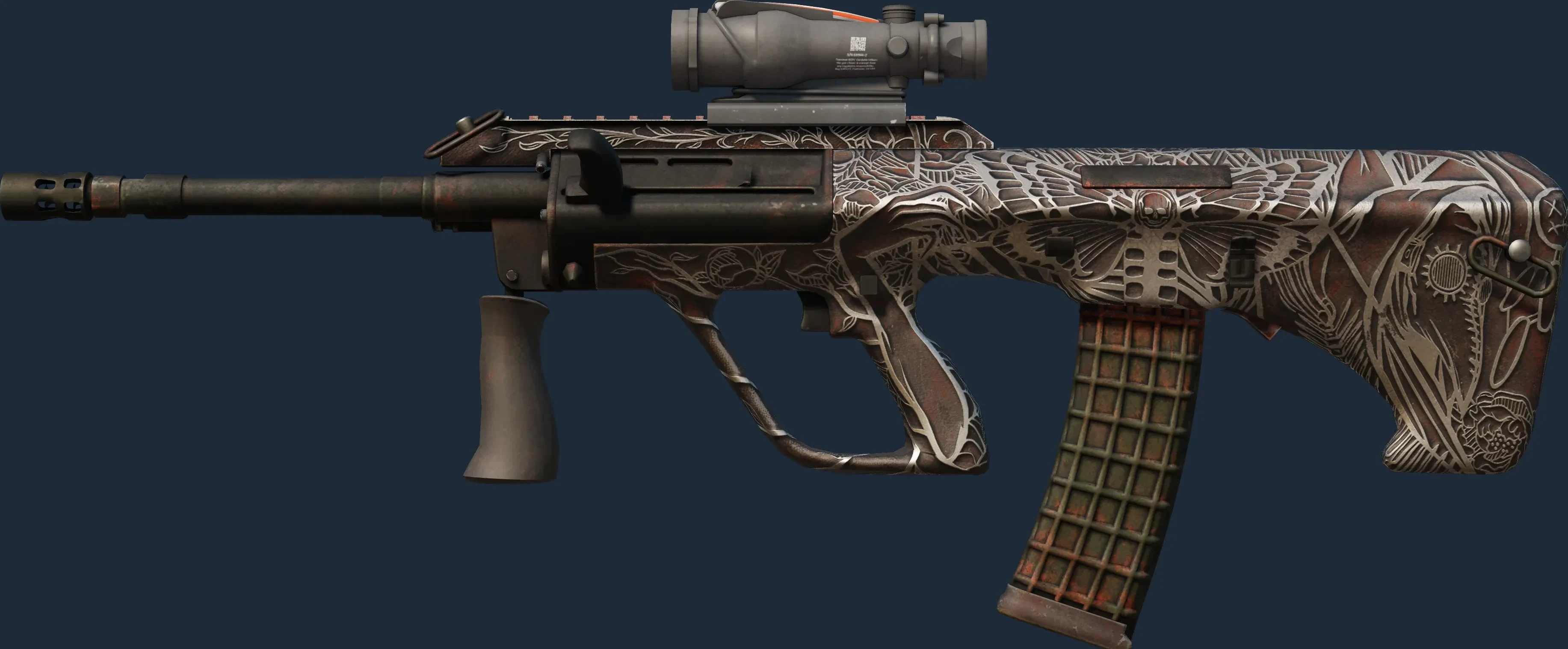 The AUG | Plague is a Covert grade skin for the AUG in Counter-Strike 2. It features a Custom Paint Job finish and was designed by hexeth.
