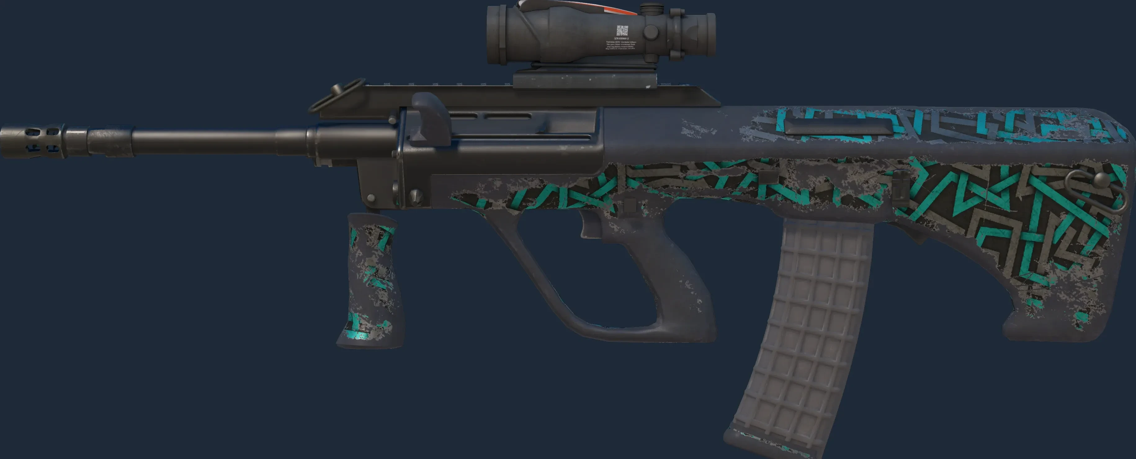 This AUG has been painted in a "Anodized Multicolored" style, with the Ricochet finish. In this style, the candy coat may be applied in a multicolored pattern. In the real world, methods could include silk-screening or adherable stencils. The primary color of this skin is composed of a cyan tint. The look of the Ricochet finish is affected by its pattern index. The skin uses the old legacy model.