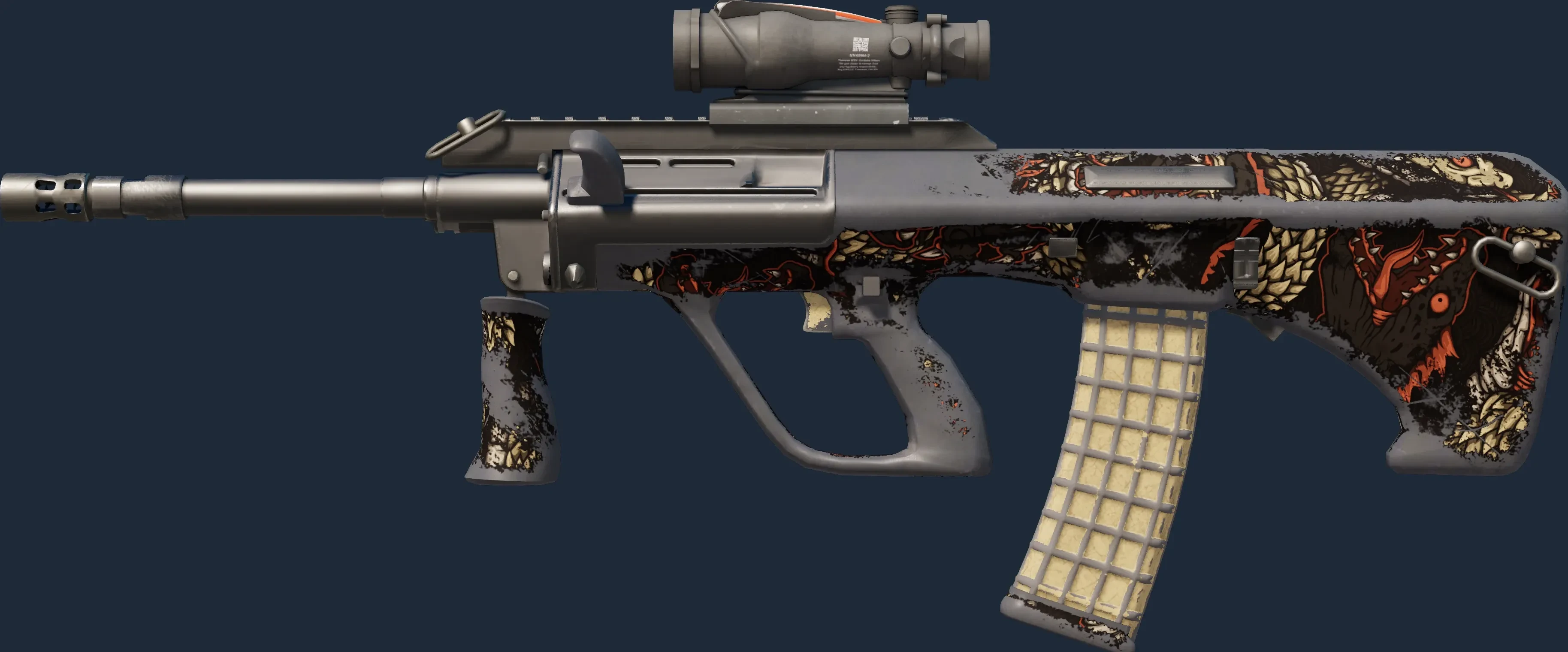 The AUG | Snake Pit is a Covert grade skin for the AUG in Counter-Strike 2. It features a Custom Paint Job finish and was designed by krM5.