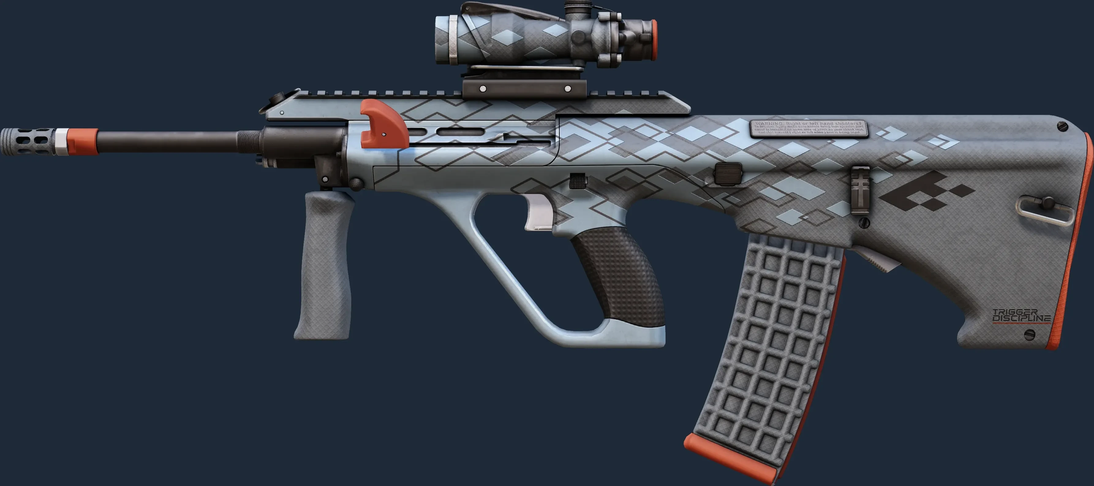 Powerful and accurate, the AUG scoped assault rifle compensates for its long reload times with low spread and a high rate of fire. A blue isometric pattern has been applied and finished with orange accents. _Patience is its own reward_