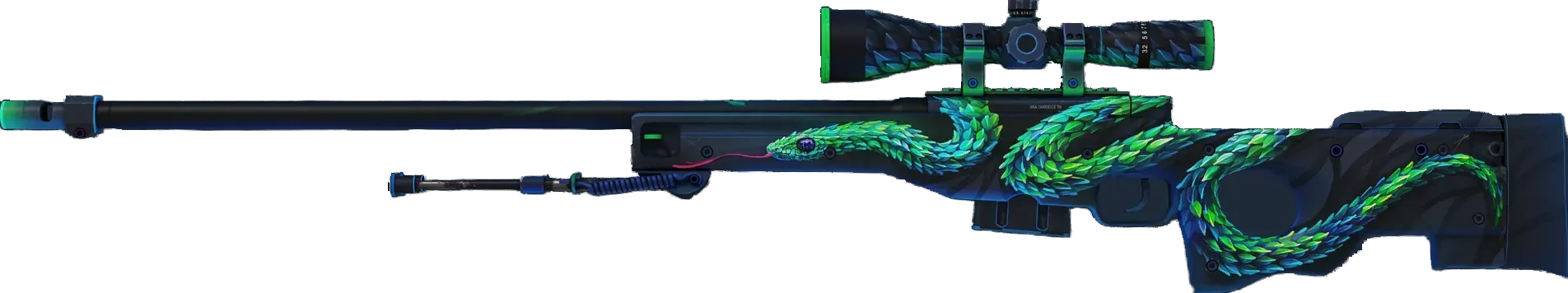 High risk and high reward, the infamous AWP is recognizable by its signature report and one-shot, one-kill policy. A striking green and blue bush viper has been hand painted over a black base. _As deadly as it is beautiful_