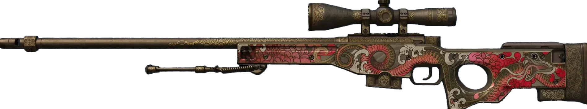 High risk and high reward, the infamous AWP is recognizable by its signature report and one-shot, one-kill policy. It has been custom painted with a snake on either side. One snake is red and the other is gold. _There's two sides to every story_