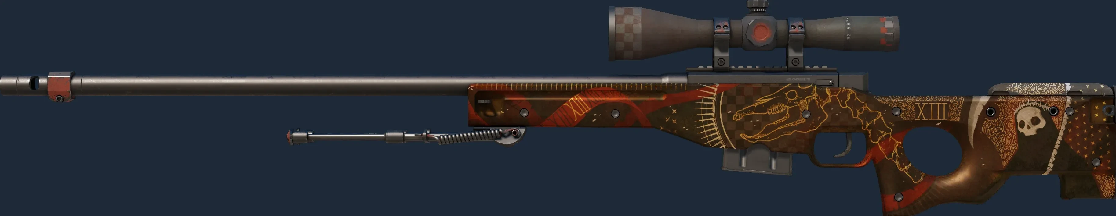 High risk and high reward, the infamous AWP is recognizable by its signature report and one-shot, one-kill policy. It has been custom painted using the Death tarot card as inspiration. _Every end is a new beginning_