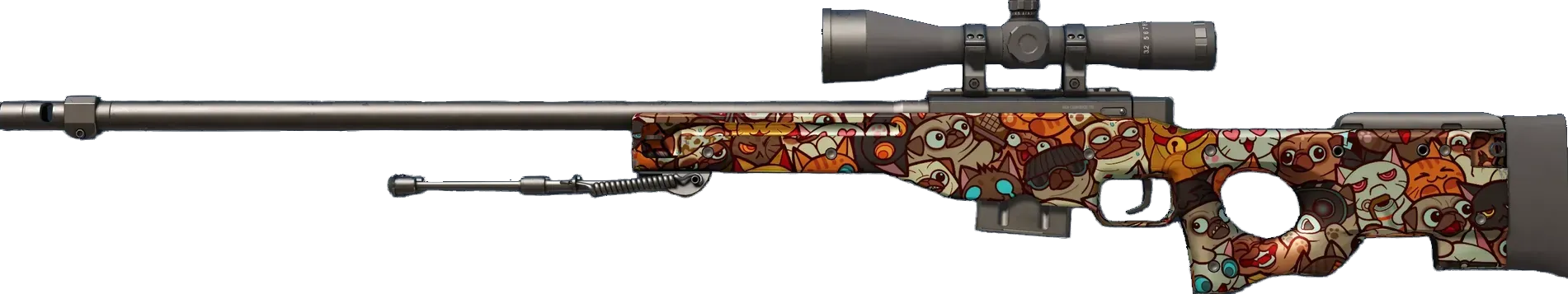 High risk and high reward, the infamous AWP is recognizable by its signature report and one-shot, one-kill policy. A pattern of felines, K-9s, and a creature with a red scarf has been applied. _Kill rewards paid in scratching posts and tennis balls_