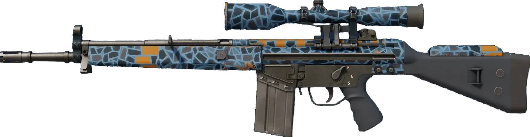 The pricy G3SG1 lowers movement speed considerably but compensates with a higher rate of fire than other sniper rifles. This memento from Ali has been painted with a mosaic hydrographic. _Patience is a virtue_