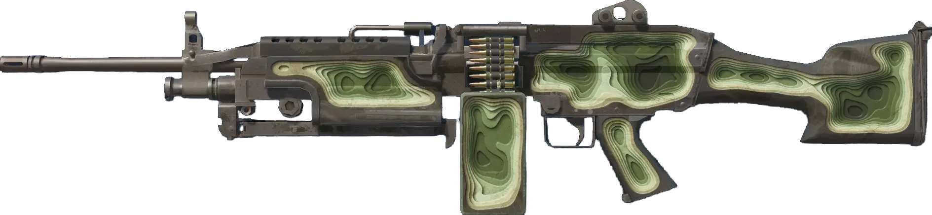 A strong open-area LMG, the M249 is the perfect choice for players willing to trade a slow fire rate for increased accuracy and a high ammo capacity. A sand-colored top layer gives way to darker greens the deeper you go. This is a custom paint job you can feel. _How many bullets to get to the center?_