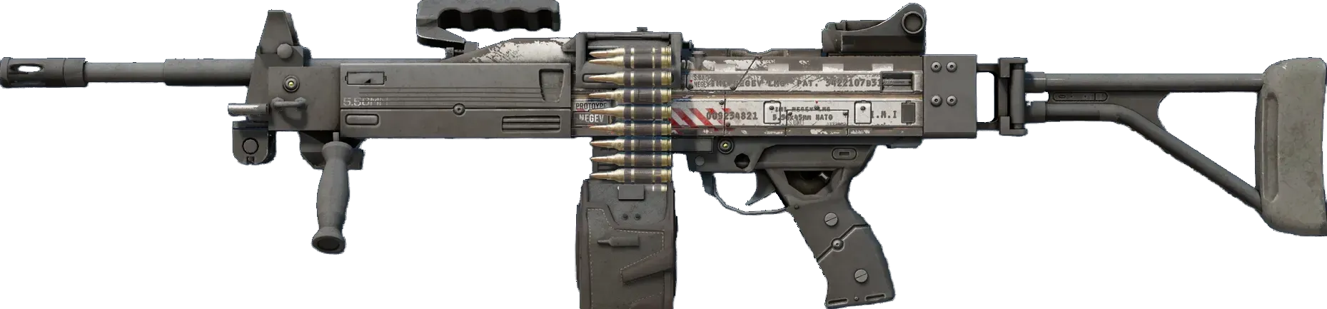 The Negev is a beast that can keep the enemy at bay with its pin-point supressive fire, provided you have the luxury of time to gain control over it. It has been custom painted in white and red, a temporary paint job while its design is finalized. _v1.2.1, PAT. 3422107_