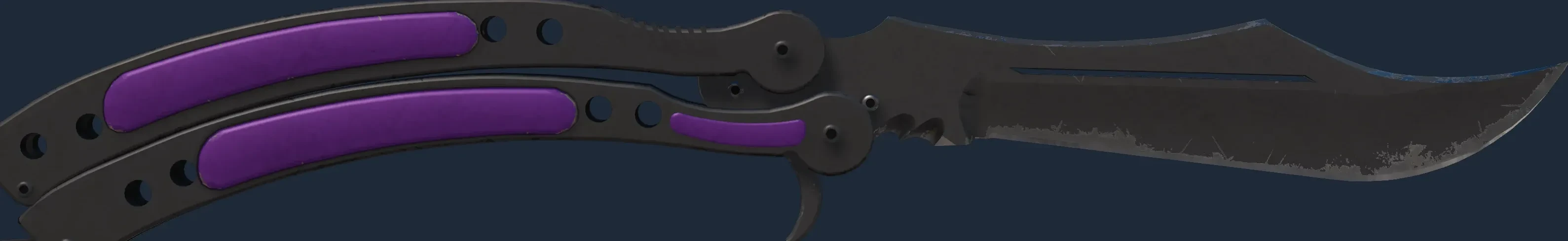 This Butterfly Knife has been painted in a "Solid Color" style, with the Ultraviolet finish. Individual components of the weapon are painted with up to four unique colors before reassembly. The skin has been painted in a color scheme of black and gray. Different pattern indexes have no effect on the Ultraviolet finish. The skin uses the new CS2 model.