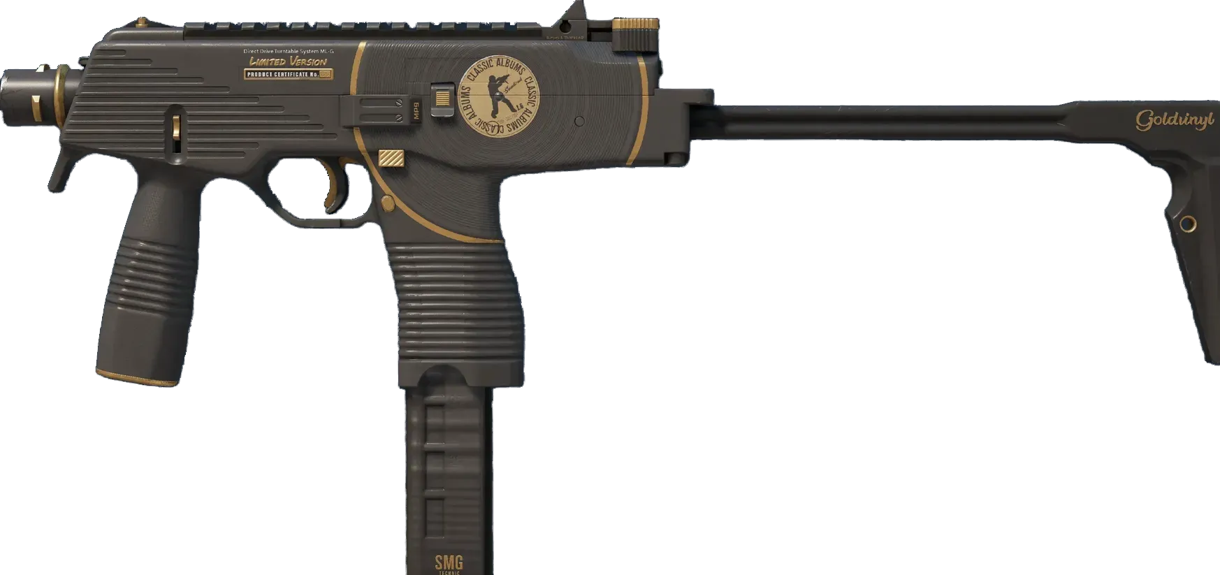 由瑞士制造,尖端的 MP9 微型冲锋枪是一把符合人类工效学的聚合物武器,深受私人保安公司青睐。 这把武器的定制涂装复刻了黑胶唱片的外观,连纹路细节都清晰呈现。nn瞬间成为经典
