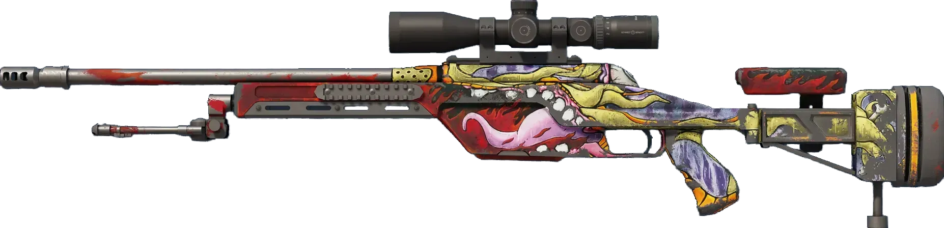 SSG08 是一把低杀伤力但性价比较高的闩动狙击步枪,是早期回合长距离射击的明智选择。 枪身绘有绿色怪物的触手、牙齿以及一只眼球。nn为了更好地看你