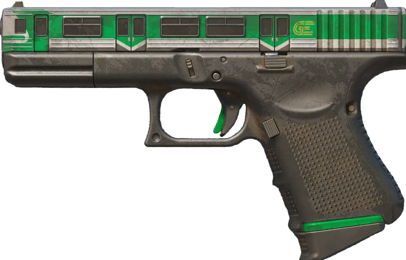 The Glock 18 is a serviceable first-round pistol that works best against unarmored opponents and is capable of firing three-round bursts. A green train car found outside Train's A site has been custom painted on the slide. _"Next stop, Train Yard—doors on your right"_