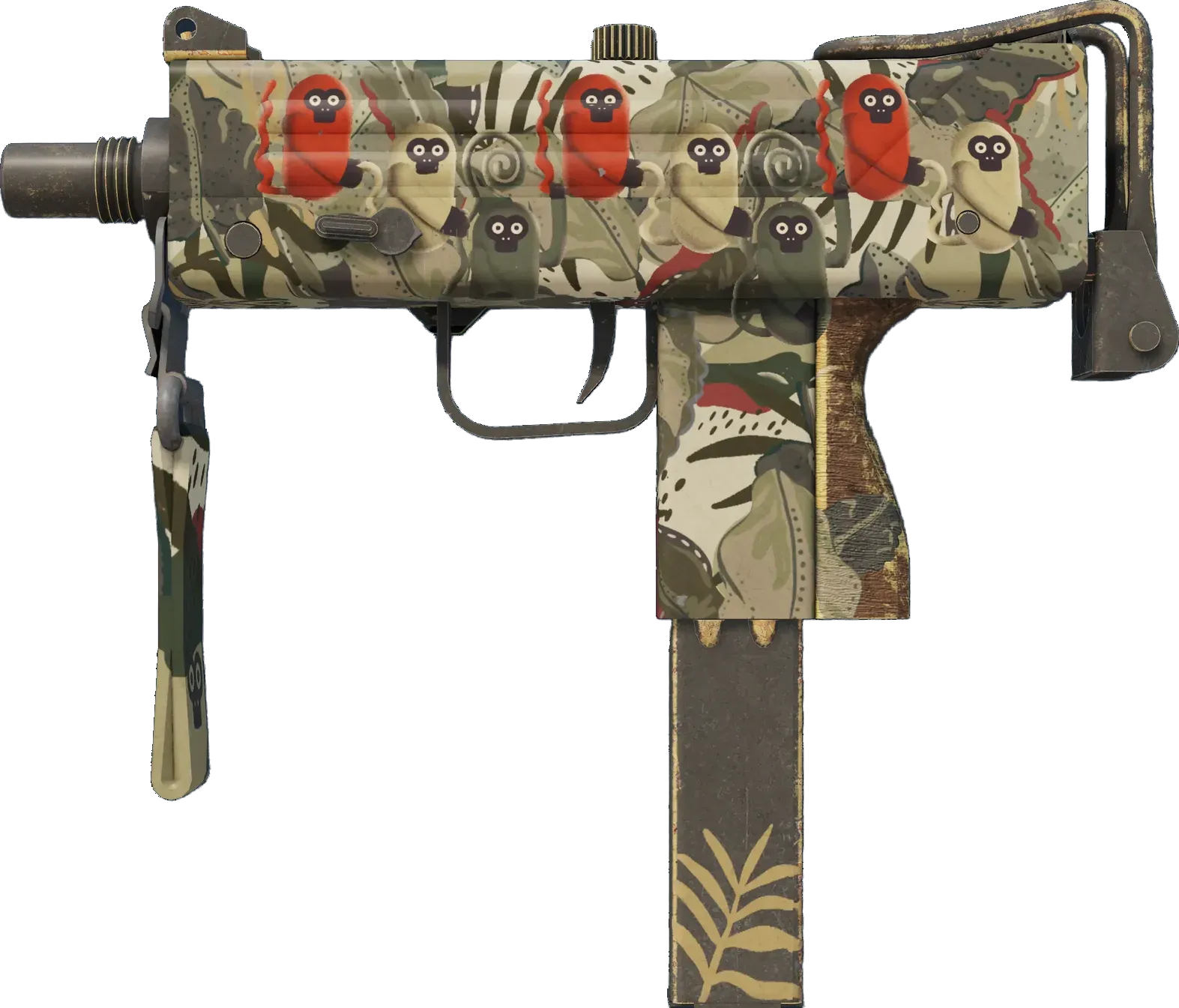 Essentially a box that bullets come out of, the MAC-10 SMG boasts a high rate of fire, with poor spread accuracy and high recoil as trade-offs. Red, tan, and green monkeys adorn this custom painted MAC-10. _Spunky monkeys!_