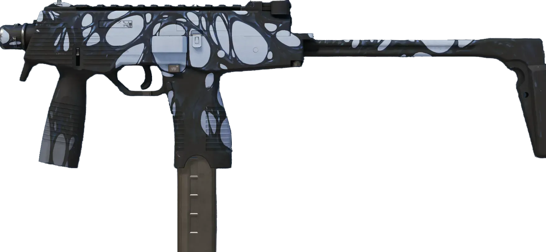 Manufactured in Switzerland, the cutting-edge MP9 SMG is an ergonomic polymer weapon favored by private security firms. It has been custom painted to resemble a tarlike goo obscuring a grey base. _Covered in spite_
