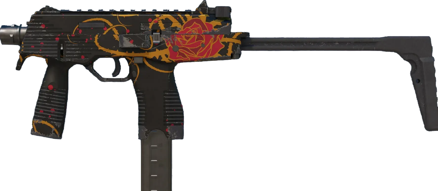 Manufactured in Switzerland, the cutting-edge MP9 SMG is an ergonomic polymer weapon favored by private security firms. It has been hand painted with a rose and thorn motif in metallic paints of different colors. _Beware its many thorns_