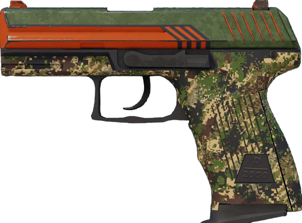 Accurate and controllable, the German-made P2000 is a serviceable first-round pistol that works best against unarmored opponents. It has been hand painted with custom green camouflage and orange detailing. _"The orange is for you, not me"_