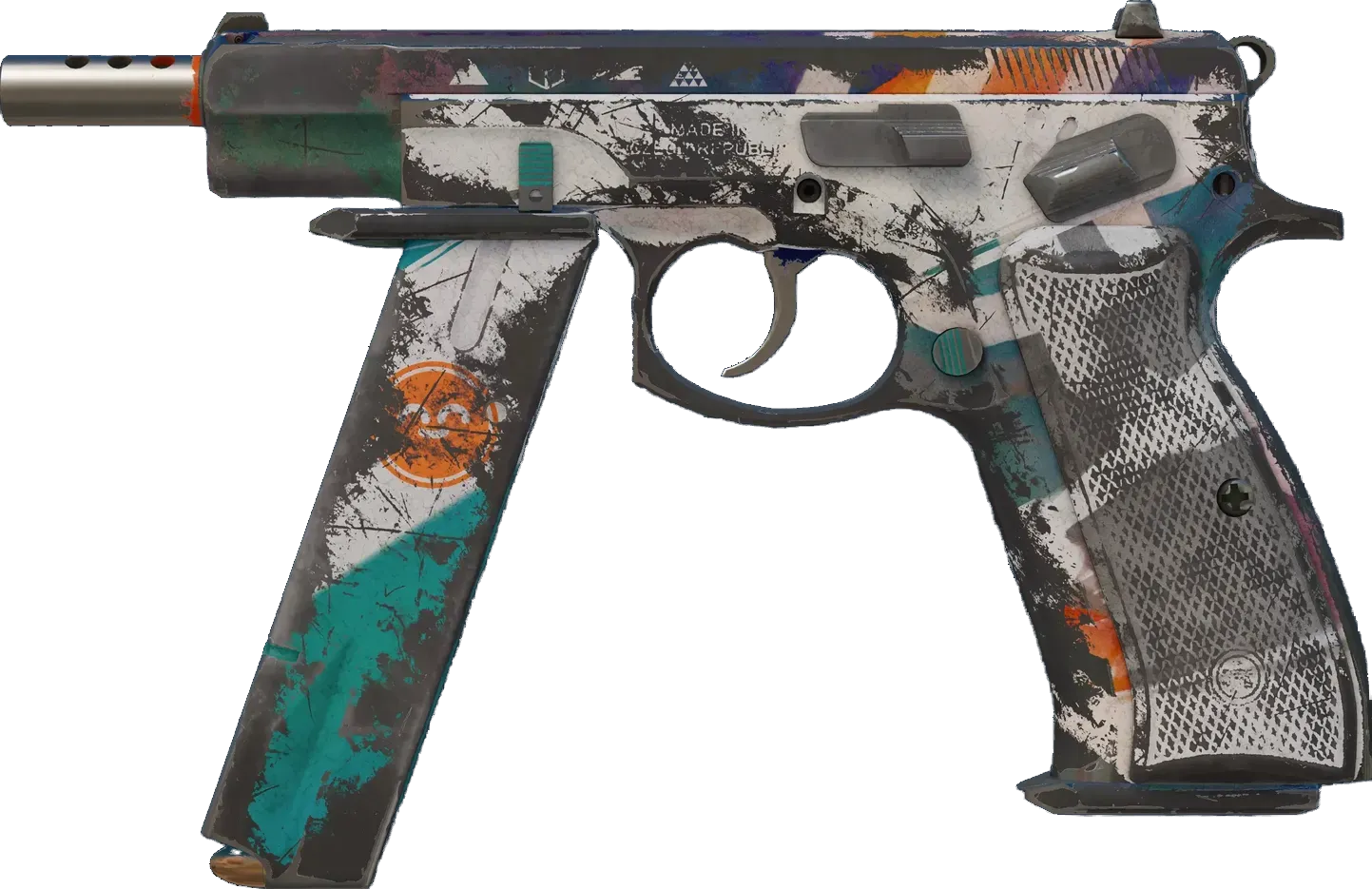 A fully automatic variant of the CZ75, the CZ75-Auto is the ideal short-term choice for turning the tables and gaining your opponents weapon. But with very little ammo in the magazine, strong trigger discipline is required. It has been custom painted with a multicolored abstract design. _Black diamond gun_