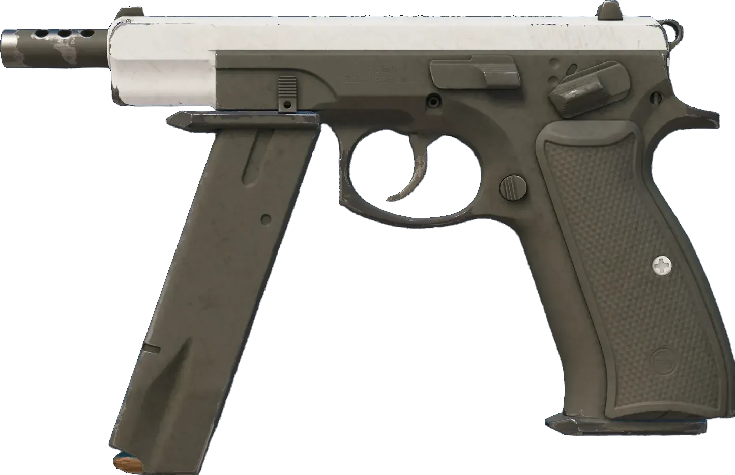 A fully automatic variant of the CZ75, the CZ75-Auto is the ideal short-term choice for turning the tables and gaining your opponents weapon. But with very little ammo in the magazine, strong trigger discipline is required. It has individual parts spray-painted solid colors in a black and white color scheme. _For when combat is a black tie affair_