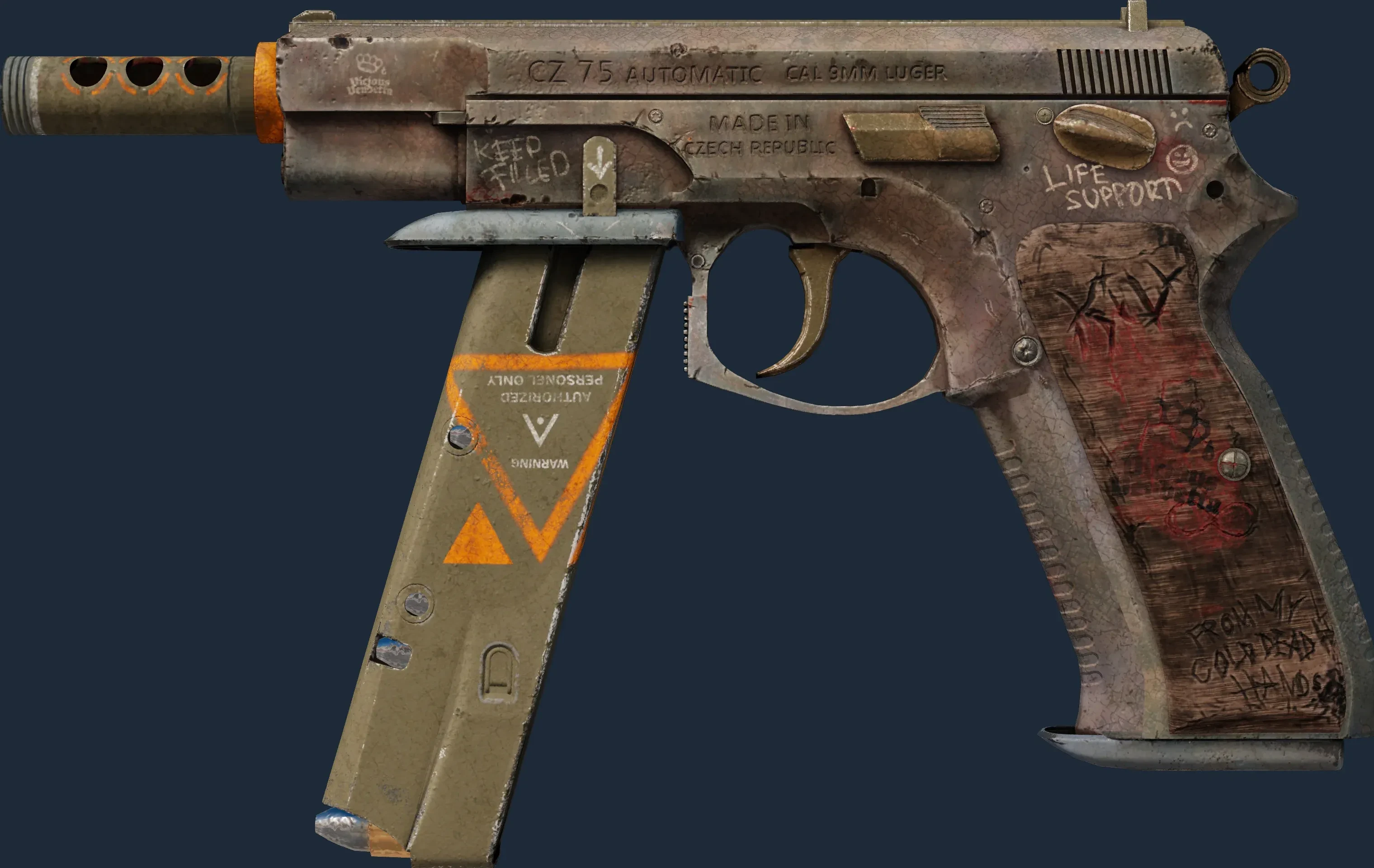 The Vendetta has a float value range from 0.00 to 1.00, making it available in 5 wear conditions: Factory New, Minimal Wear, Field-Tested, Well-Worn, Battle-Scarred.