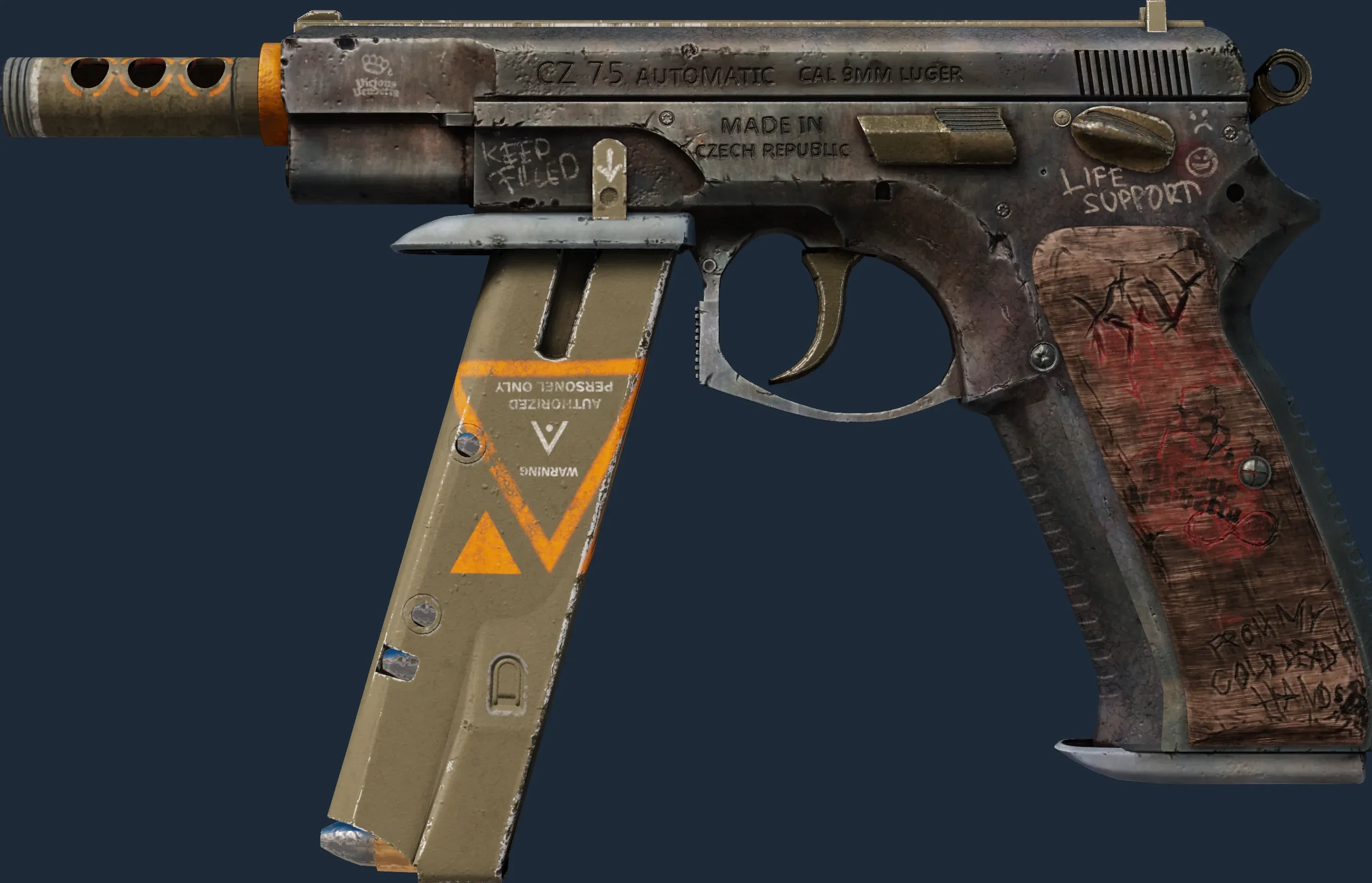 The CZ75-Auto | Vendetta is a Covert grade skin for the CZ75-Auto in Counter-Strike 2. It features a Custom Paint Job finish and was designed by emu.