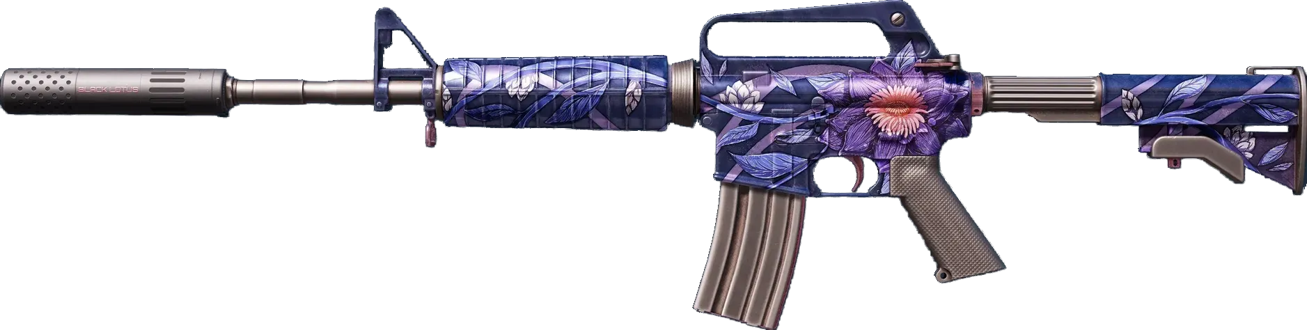 With a smaller magazine than its unmuffled counterpart, the silenced M4A1 provides quieter shots with less recoil and better accuracy. It has been custom painted with a black lotus flower over a blue and purple base. _Adds 2 kills during rifle round, then is discarded_