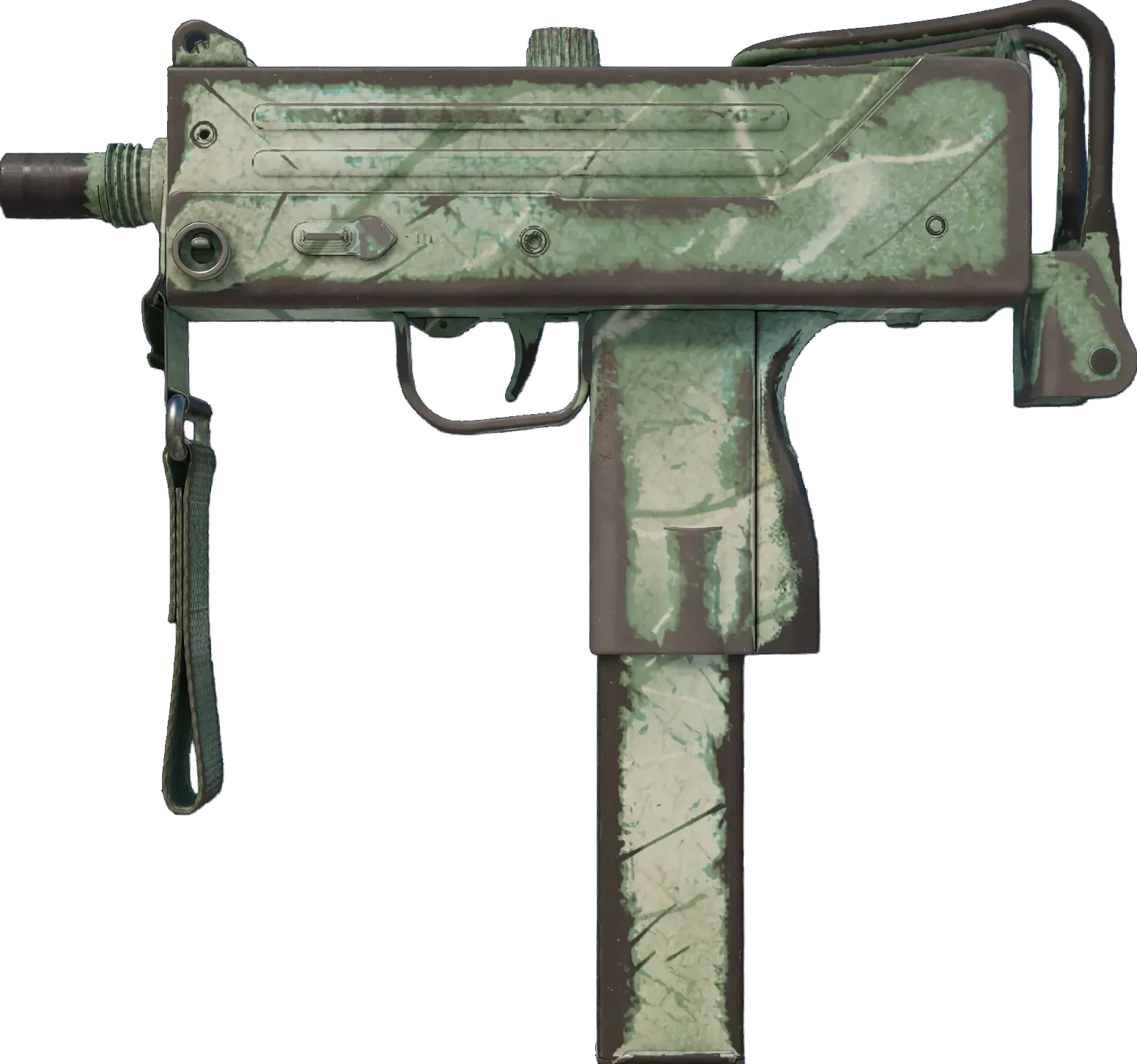 Essentially a box that bullets come out of, the MAC-10 SMG boasts a high rate of fire, with poor spread accuracy and high recoil as trade-offs. It has been spray-painted with a pale green and cream colored design. _Mint condition_