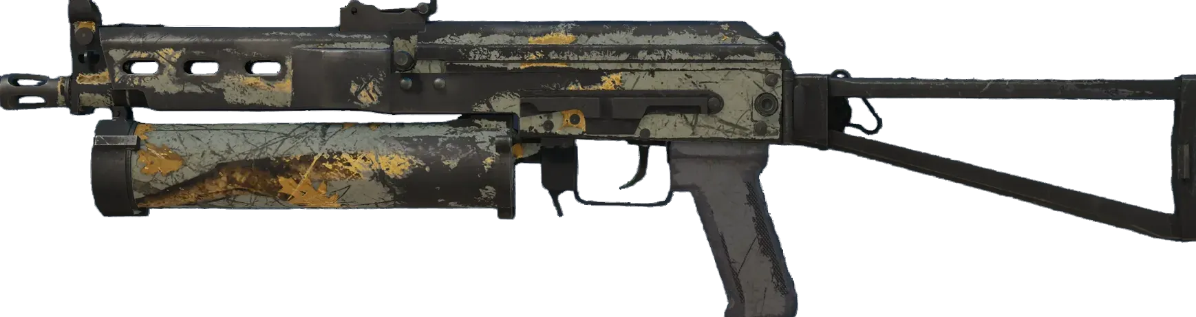 The Bizon SMG is low-damage, but offers a uniquely designed high-capacity drum magazine that reloads quickly. It has been painted using a photographic hunting camo hydrographic.