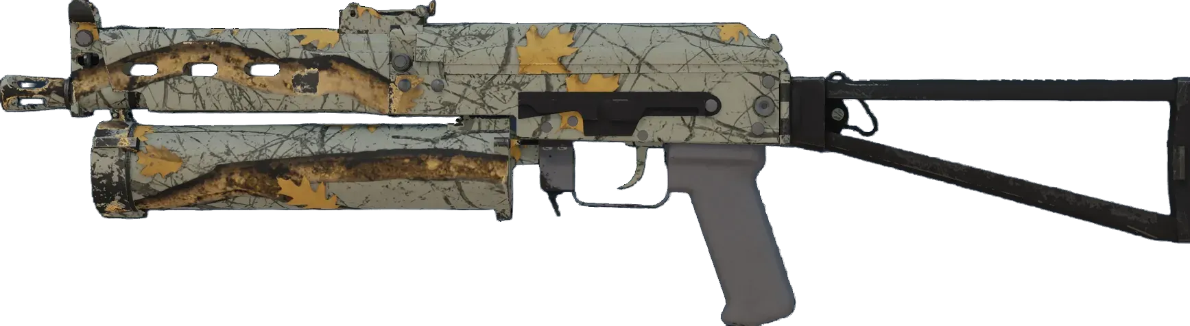The Bizon SMG is low-damage, but offers a uniquely designed high-capacity drum magazine that reloads quickly. It has been painted using a photographic hunting camo hydrographic.