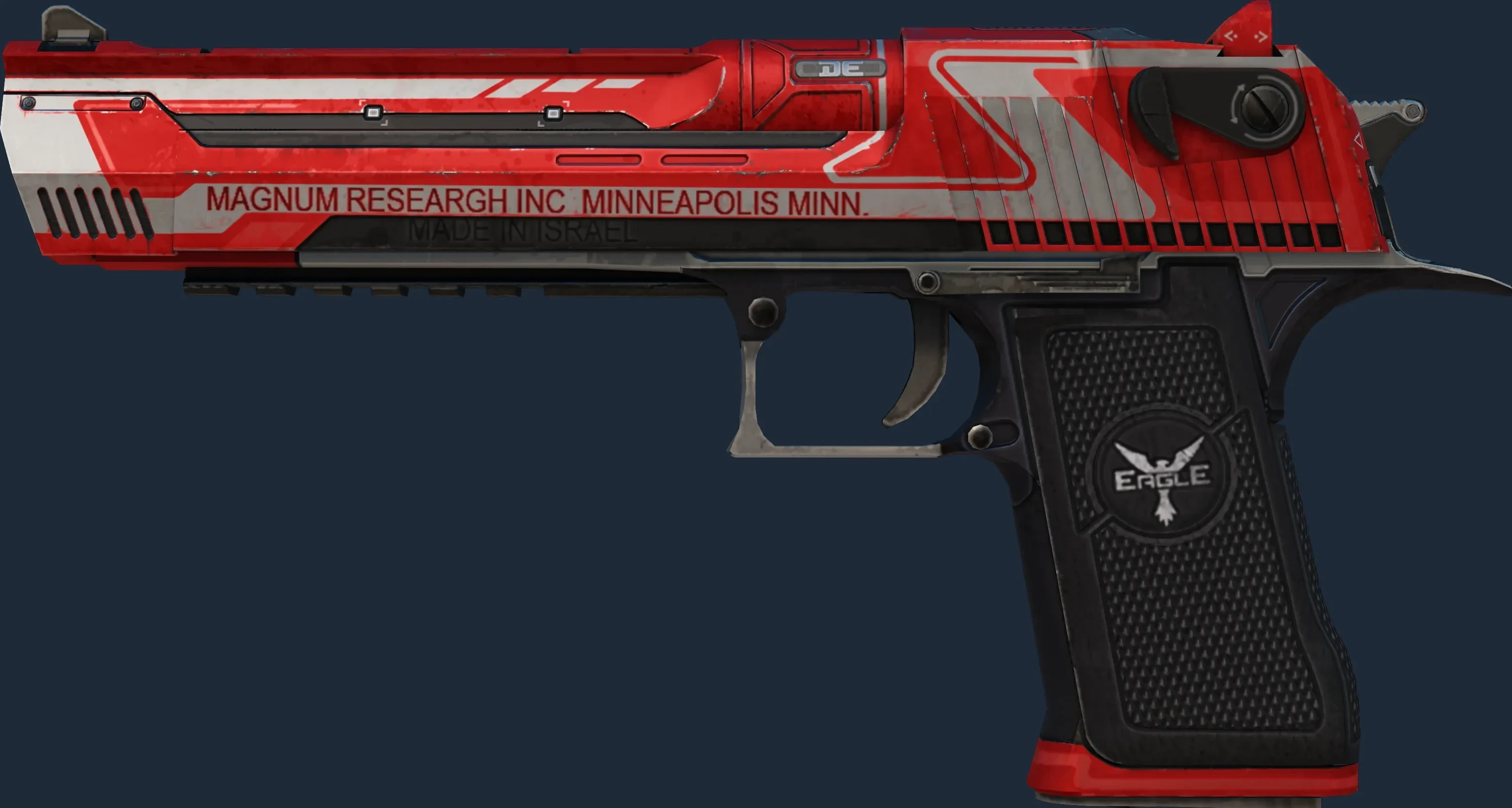 This Desert Eagle has been painted in a "Gunsmith" style, with the Code Red finish. This style uses a combination of patina and custom paint styles. The primary color of this skin is composed of a red tint. Different pattern indexes have no effect on the Code Red finish. The skin uses the old legacy model.