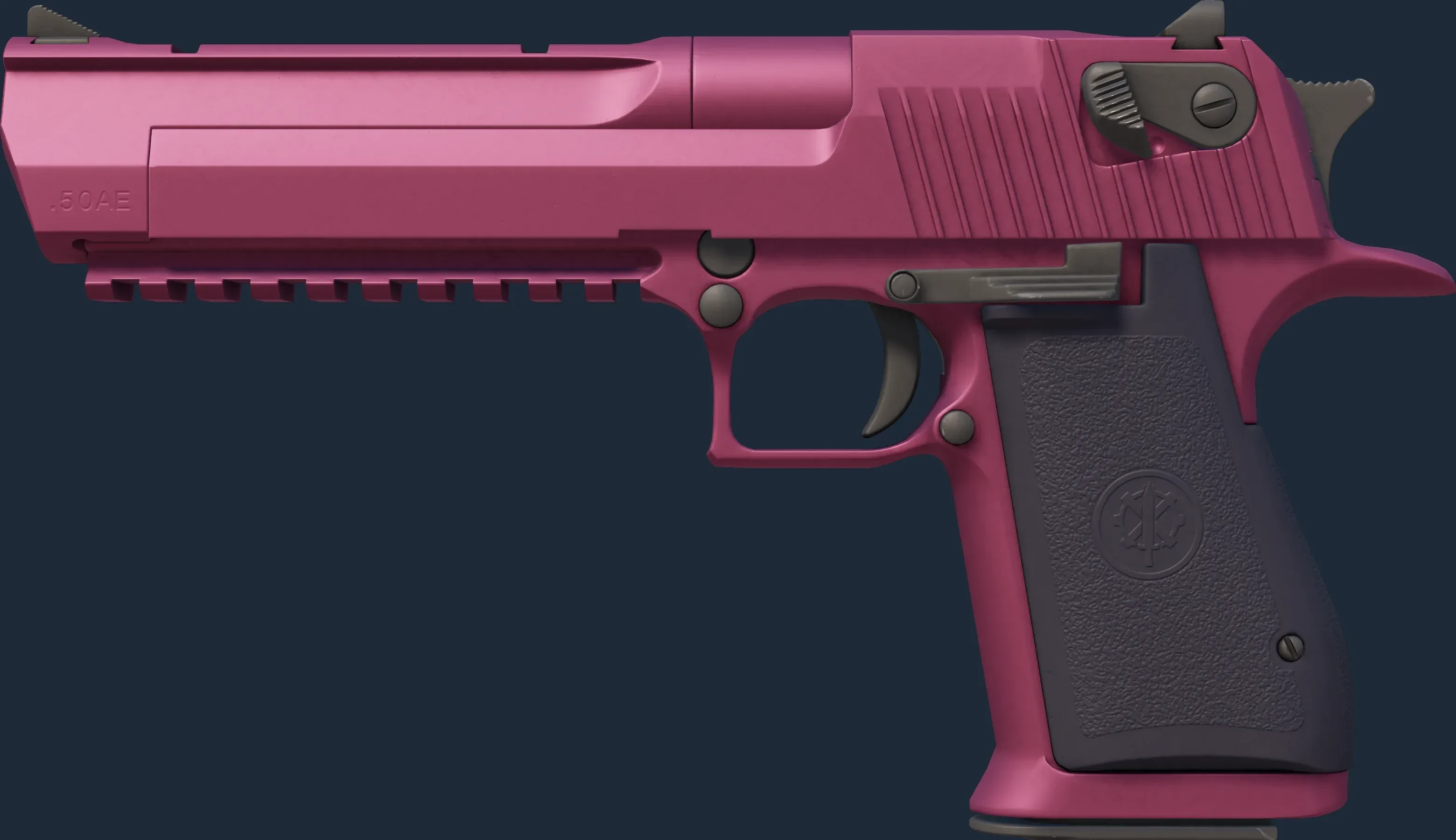 This Desert Eagle has been painted in a "Solid Color" style, with the Mulberry finish. Individual components of the weapon are painted with up to four unique colors before reassembly. The primary color of this skin is composed of a purple tint. Different pattern indexes have no effect on the Mulberry finish. The skin uses the new CS2 model.