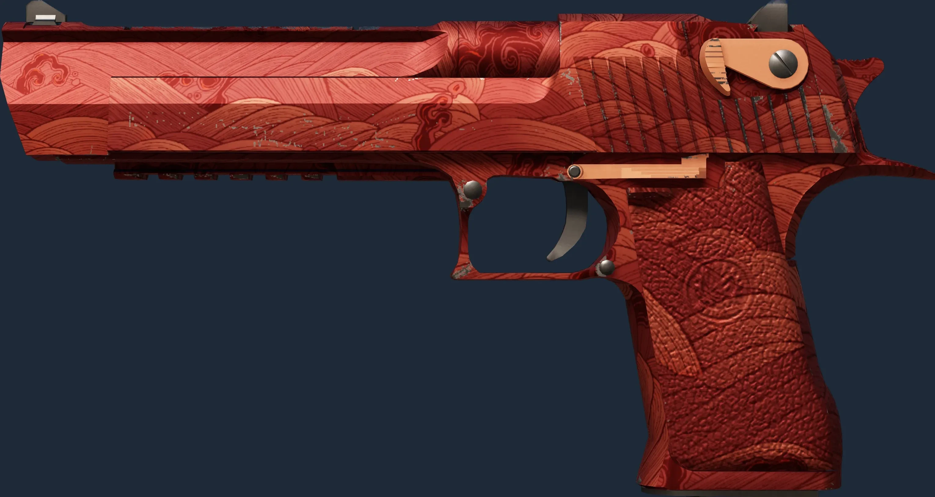 The Desert Eagle | Sunset Storm 1 is a Covert grade skin for the Desert Eagle in Counter-Strike 2. It features a Custom Paint Job finish and was designed by Valve.