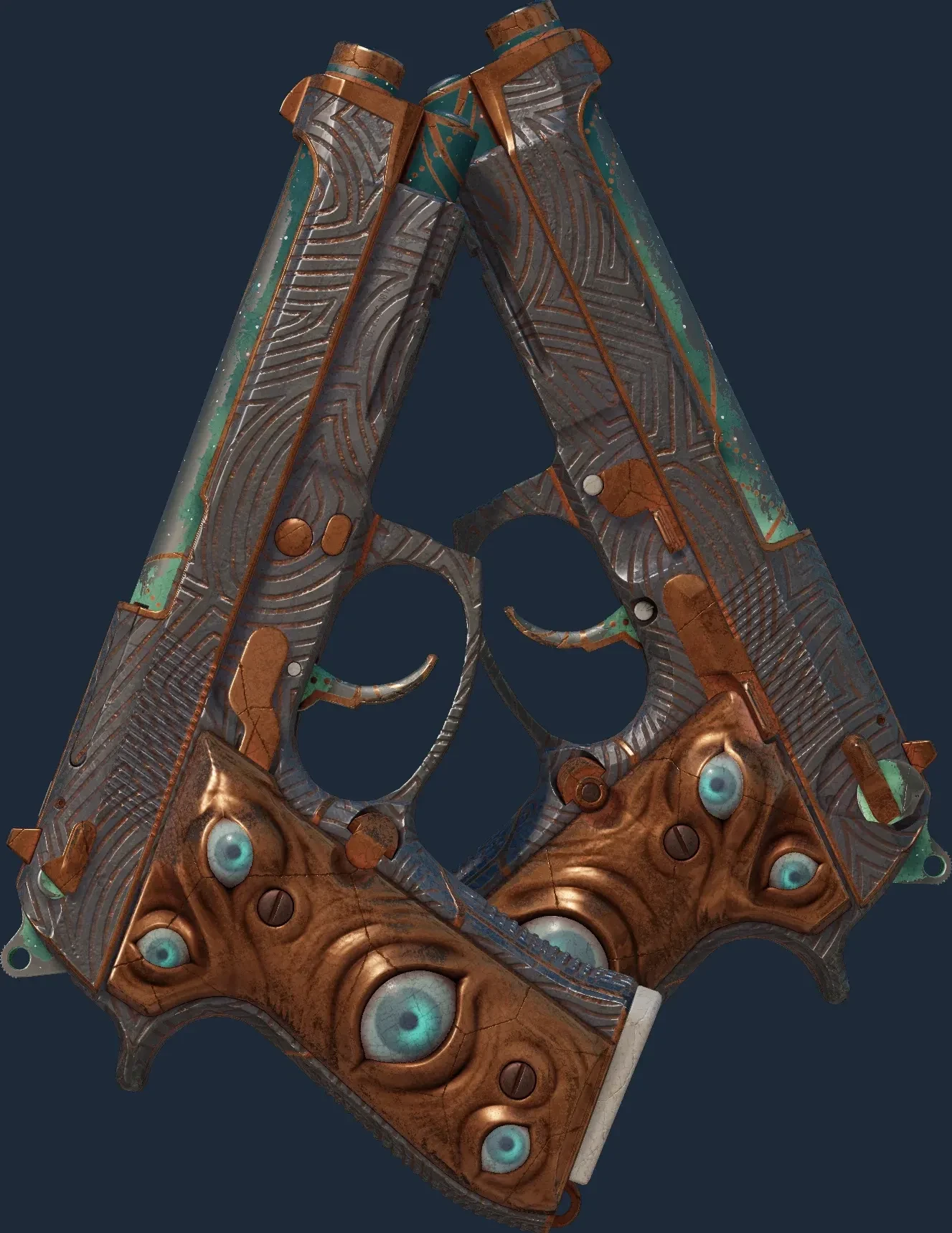 The Dual Berettas | Angel Eyes is a Covert grade skin for the Dual Berettas in Counter-Strike 2. It features a Custom Paint Job finish and was designed by Chemical Alia.