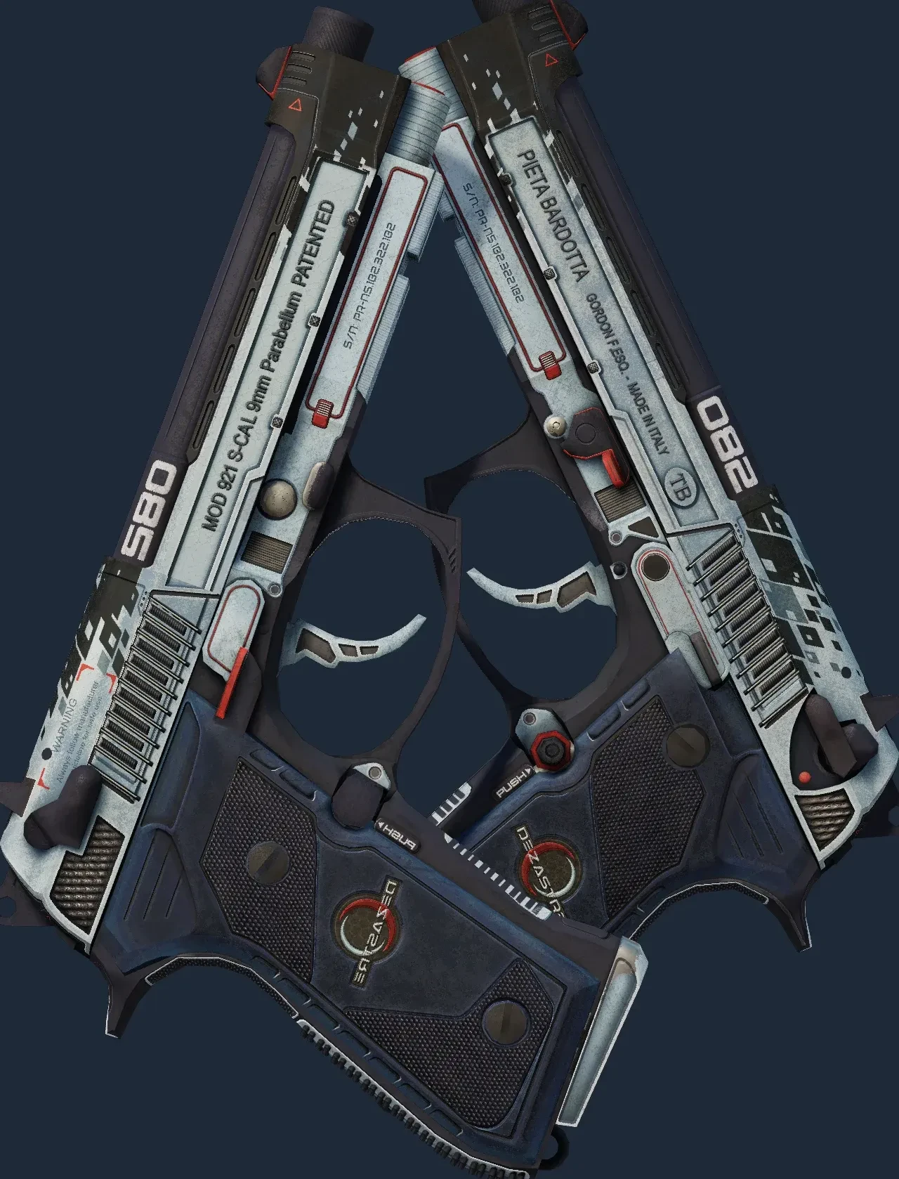 The Dual Berettas | Dezastre is a Covert grade skin for the Dual Berettas in Counter-Strike 2. It features a Custom Paint Job finish and was designed by Des.