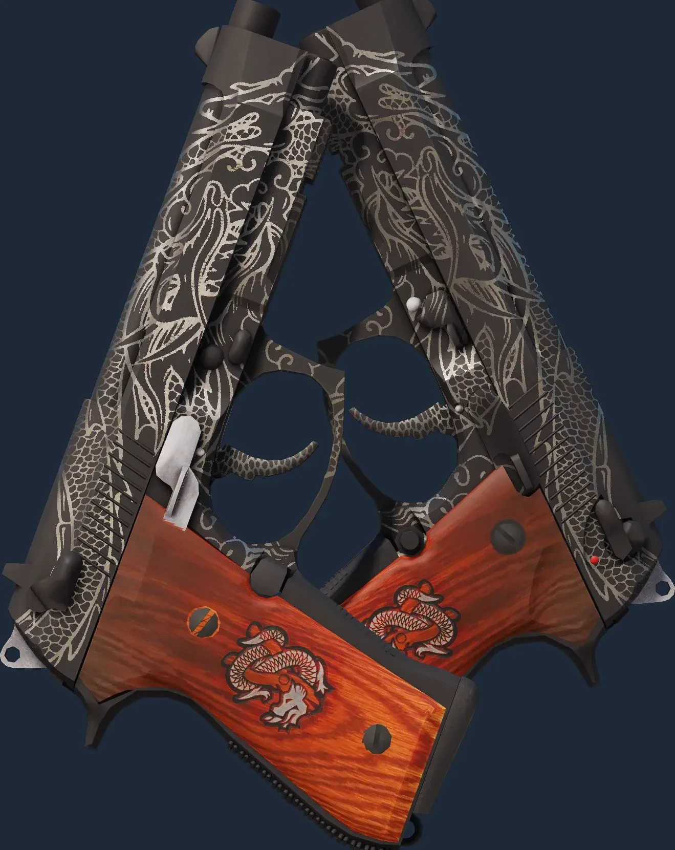 The Dual Berettas | Dualing Dragons is a Covert grade skin for the Dual Berettas in Counter-Strike 2. It features a Custom Paint Job finish and was designed by The Honey Badger.