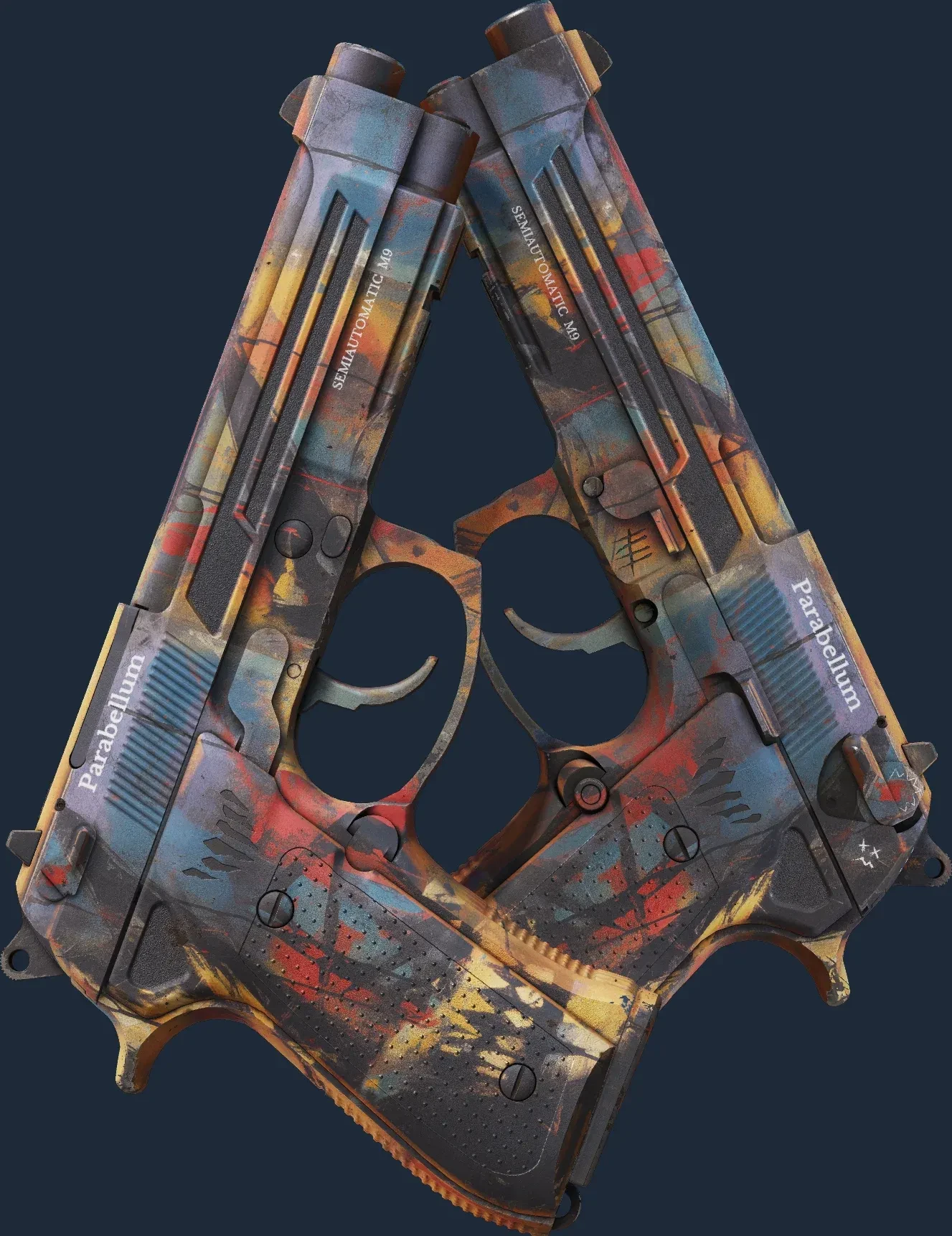 The Dual Berettas | Hideout is a Covert grade skin for the Dual Berettas in Counter-Strike 2. It features a Custom Paint Job finish and was designed by Ryuken.