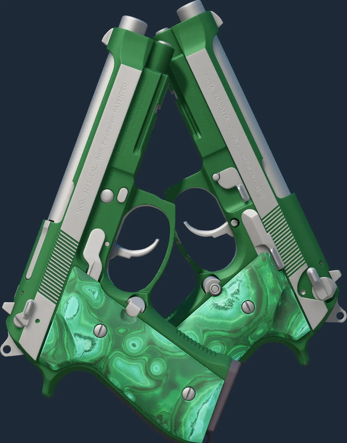 The Dual Berettas | Polished Malachite is a Covert grade skin for the Dual Berettas in Counter-Strike 2. It features a Custom Paint Job finish and was designed by Valve.