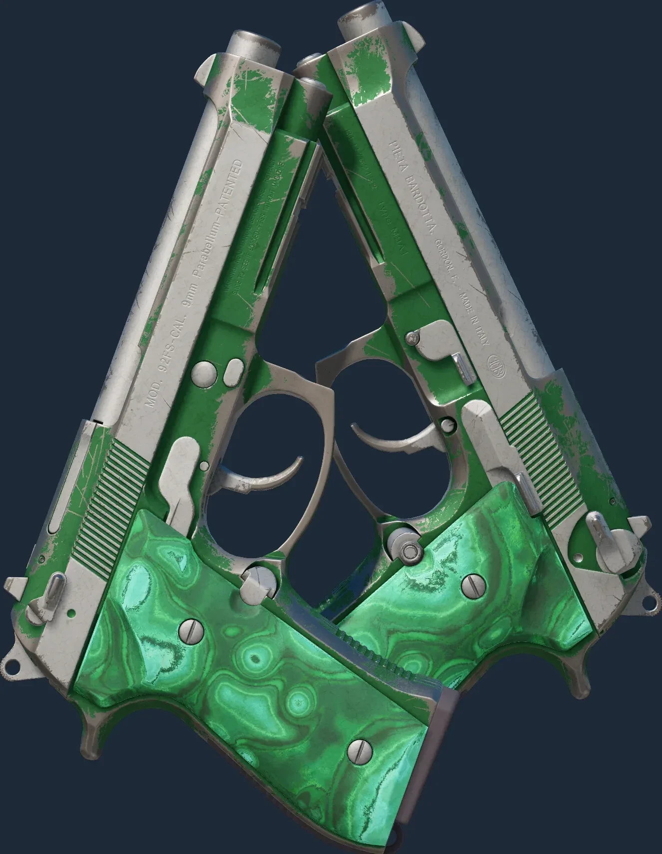 The Dual Berettas | Polished Malachite is a Covert grade skin for the Dual Berettas in Counter-Strike 2. It features a Custom Paint Job finish and was designed by Valve.