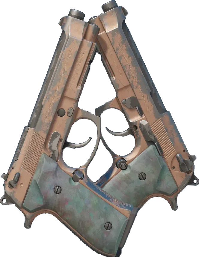 Firing two large-mag Berettas at once will lower accuracy and increase load times. On the bright side, you'll get to fire two large-mag Berettas at once. The metal of these Dual Berettas has been painted rose gold and the grips are a nacred, deep jade color. _You can't make an omelette without cracking a few jeweled eggs_