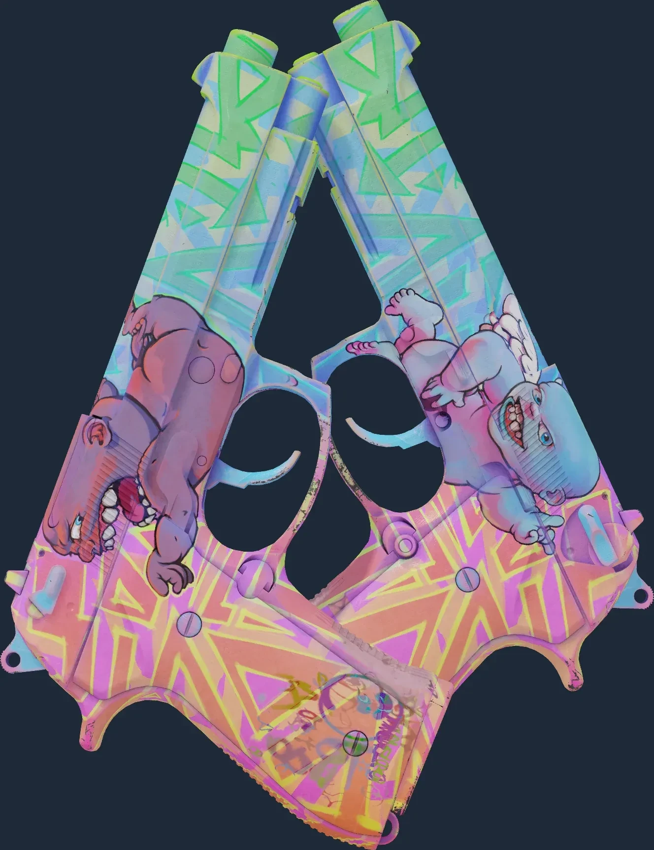 The Dual Berettas | Sweet Little Angels is a Covert grade skin for the Dual Berettas in Counter-Strike 2. It features a Custom Paint Job finish and was designed by Valve.