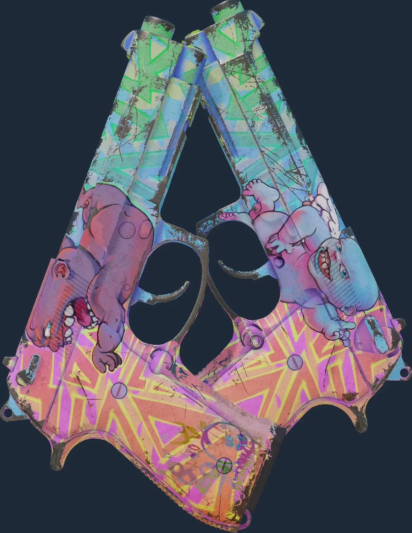 The Dual Berettas | Sweet Little Angels is a Covert grade skin for the Dual Berettas in Counter-Strike 2. It features a Custom Paint Job finish and was designed by Valve.