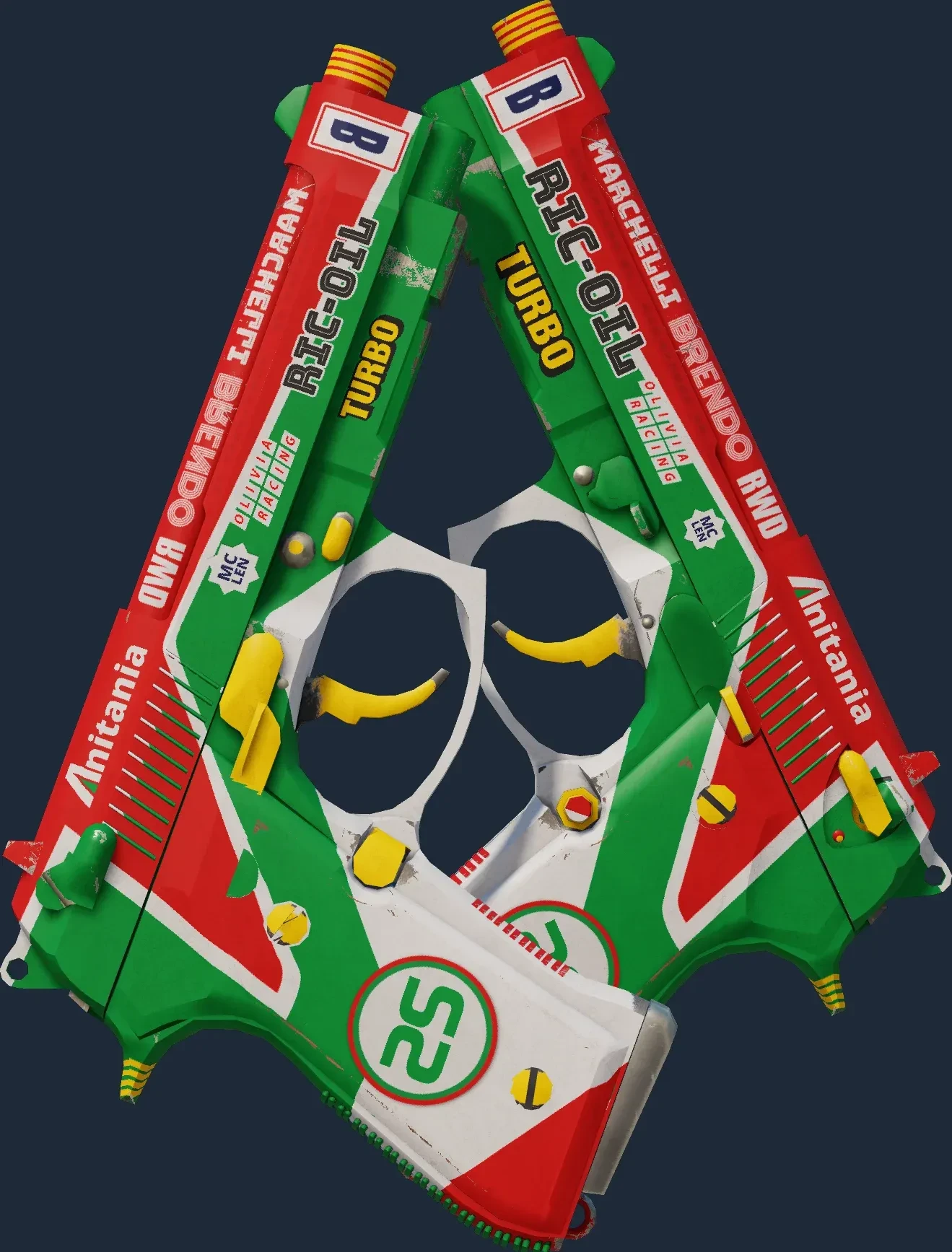 The Dual Berettas | Twin Turbo is a Covert grade skin for the Dual Berettas in Counter-Strike 2. It features a Custom Paint Job finish and was designed by Valve.