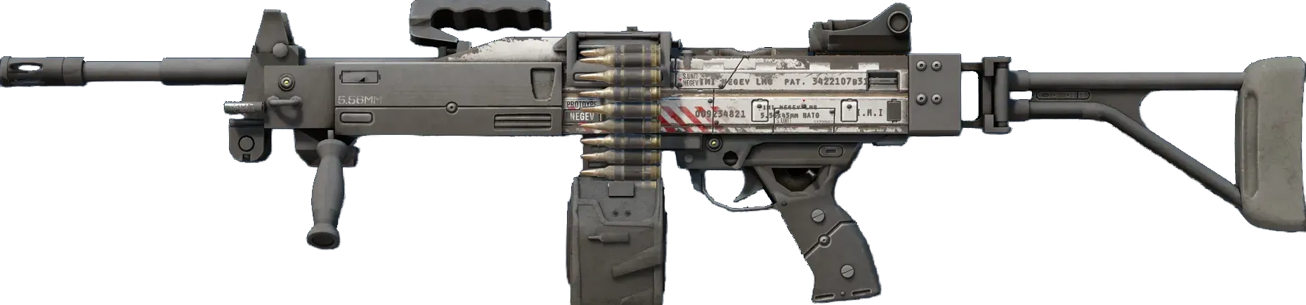 The Negev is a beast that can keep the enemy at bay with its pin-point supressive fire, provided you have the luxury of time to gain control over it. It has been custom painted in white and red, a temporary paint job while its design is finalized. _v1.2.1, PAT. 3422107_