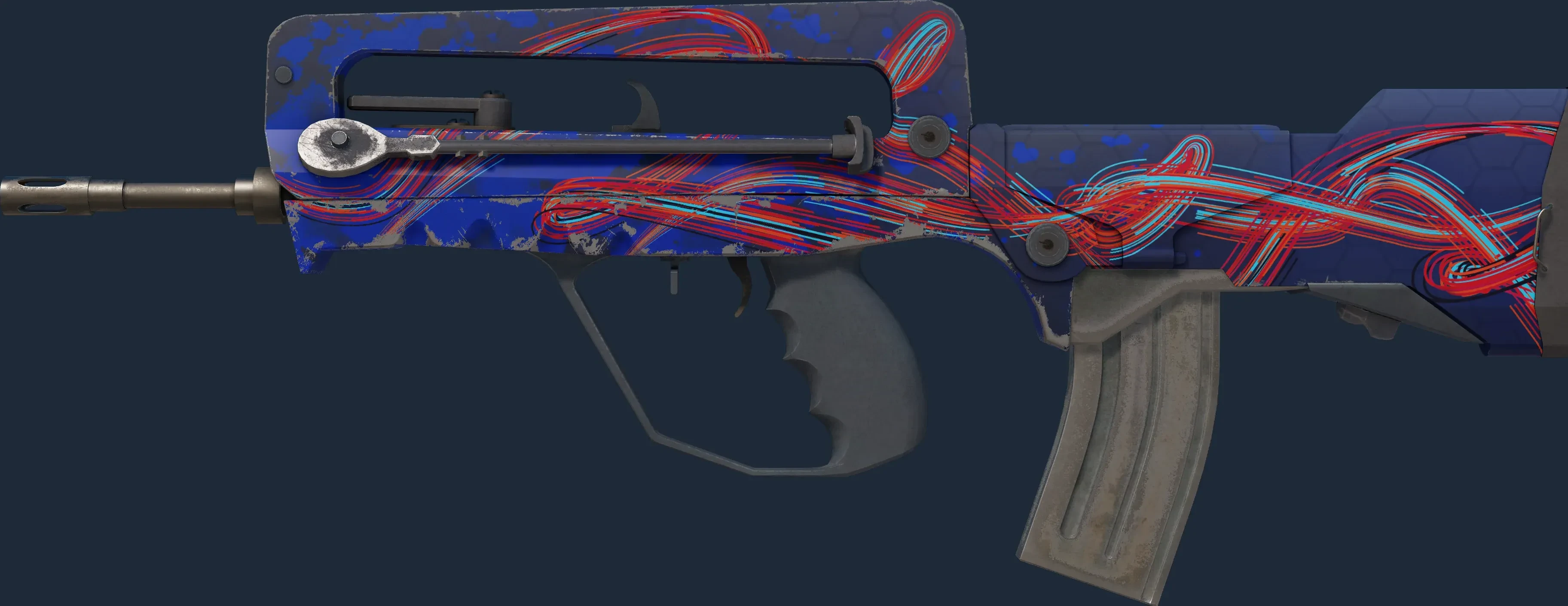 This FAMAS has been painted in a "Custom Paint Job" style, with the Afterimage finish. This style enables extremely customized looks in a full range of colors. The primary color of this skin is composed of a blue tint. Different pattern indexes have no effect on the Afterimage finish. The skin uses the old legacy model.