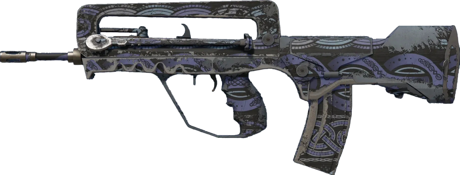 A cheap option for cash-strapped players, the FAMAS effectively fills the niche between more expensive rifles and the less-effective SMGs. It has been spray-painted with a Norse inspired pattern of interlocking blue rings. _"It is better to fight and fall than to live without hope"_